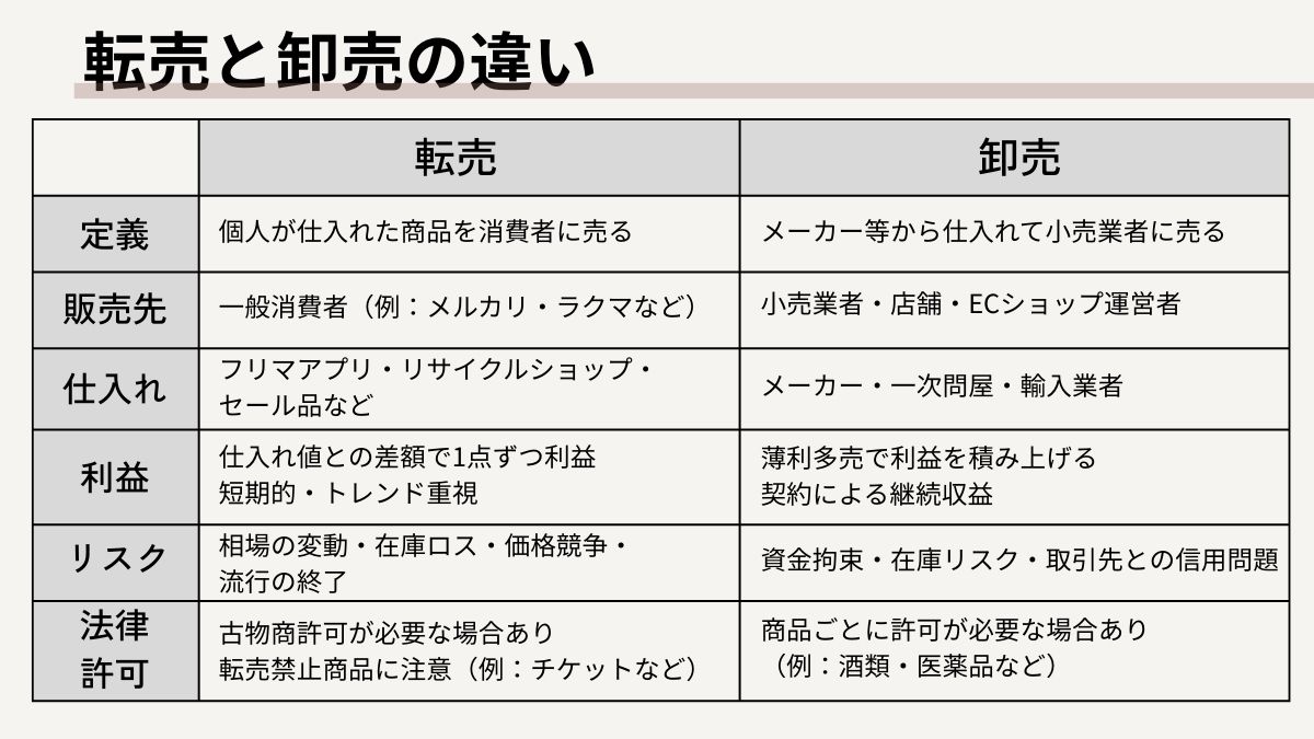 つまり、転売は「個人の手軽なビジネス」、卸売は「事業としての本格的な取引」といったイメージです。